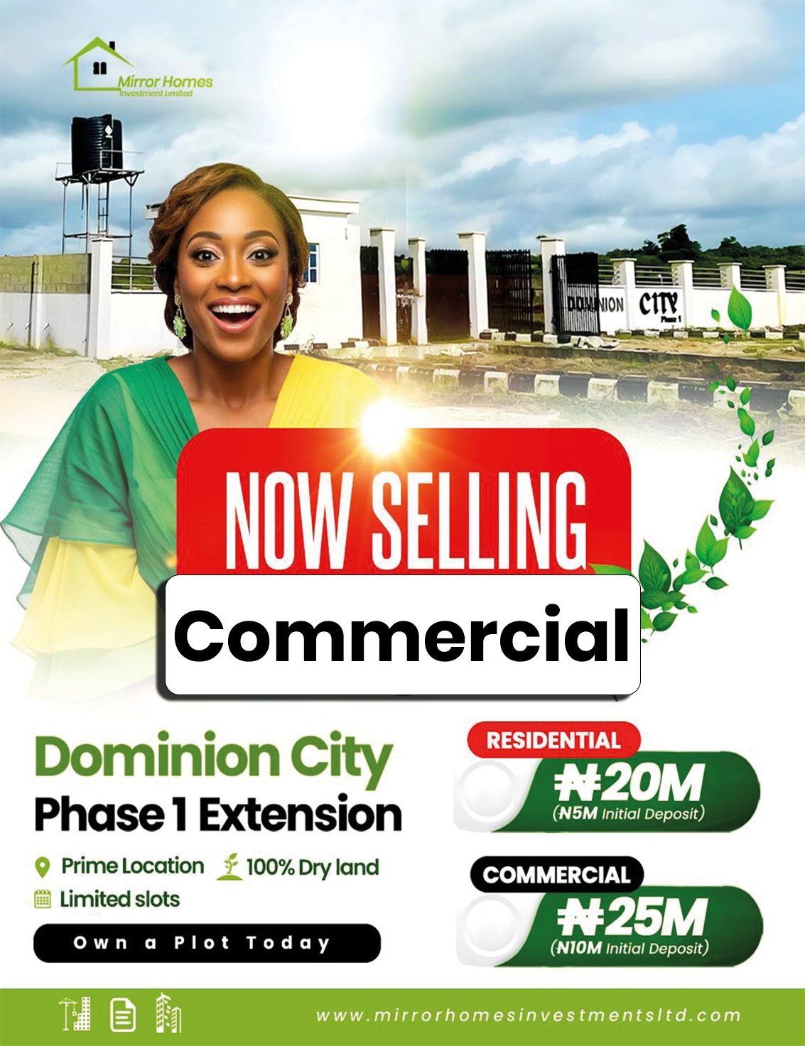DOMINION CITY EXTENSION is An Express Land located less than 5min from Epe T-Junction. It is directly Facing Isimi Lagos and also directly facing the Epe-Ikorodu Expressway, Lagos.